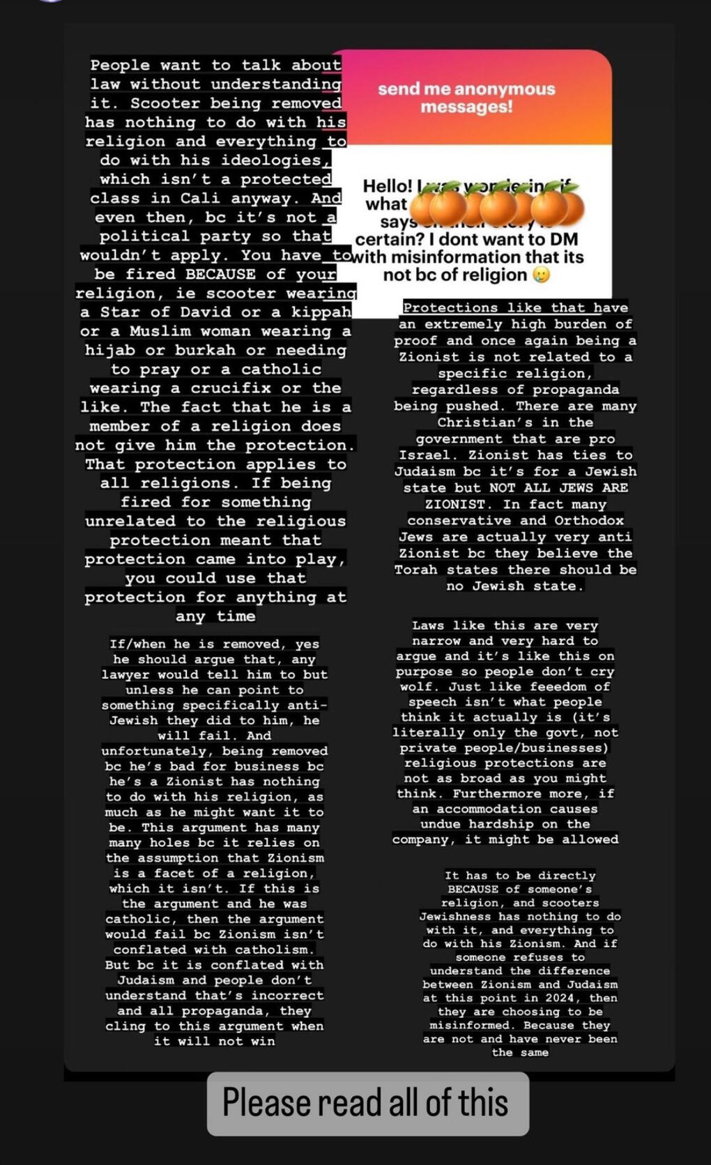 cr:@burbankbleacher : full threadCan Scooter be fired?The goal is to fire him because he is a Zionist sharing harmful lies. To those that say HYBE can’t fire Scooter, yes they absolutely can. Zionism is not a protected class under US discrimination law, and a Jewish attorney has shared her helpful views below. Key point: Protections like that have an extremely high burden of proof and once again being a Zionist is not related to a specific religion, regardless of propaganda being pushed.